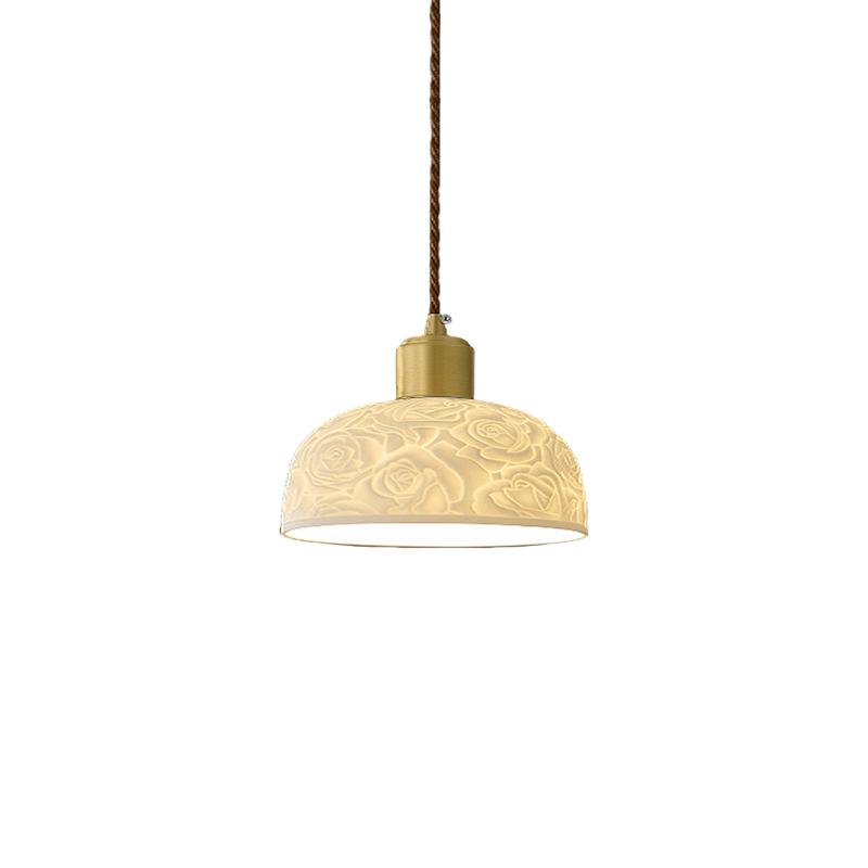 This pendant lamp features a delicate rose pattern on the ceramic shade, creating a striking, sophisticated lighting fixture for any room.
