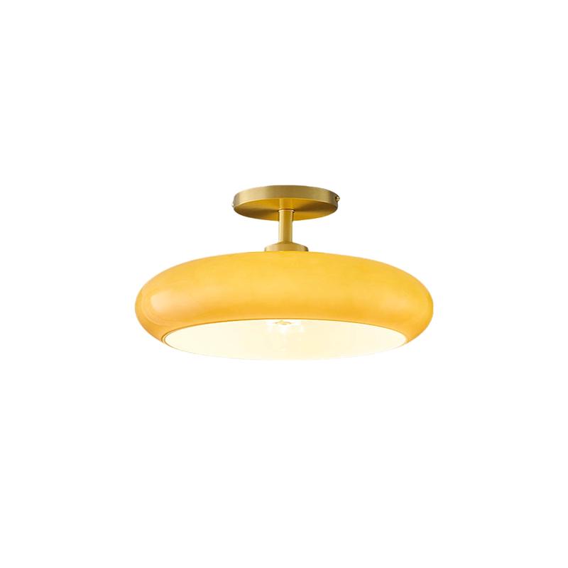 This round flush mount ceiling light features a sleek brass frame and a glass shade. Its retro design adds a stylish, soft glow to any room, blending modern and vintage elements seamlessly.