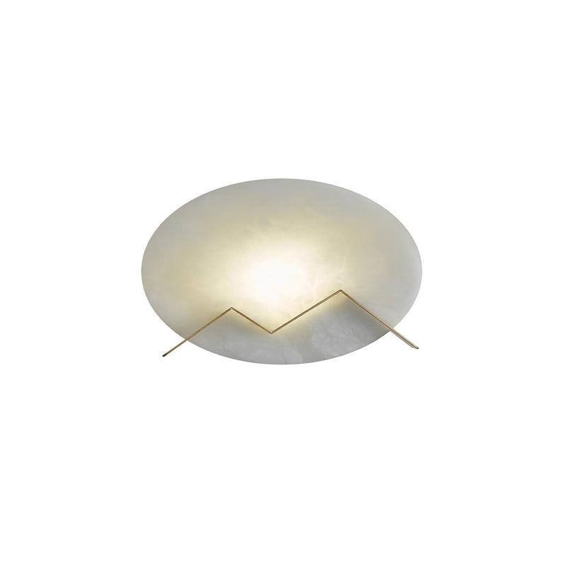 The Round M Letter Alabaster Wall Lamp showcases a circular piece of natural alabaster held by a metal frame with a natural brass finish. The light shines by creating warm diffuse lighting, Install it in any space to create a soft, warm glow.