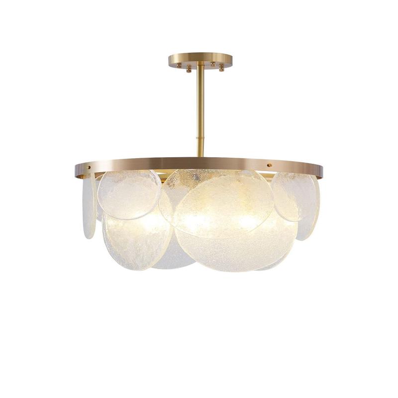 This Sasha chandelier features expertly crafted handmade glass and satin brass. The individual glass pieces are one-of-a-kind, as they are hand-shaped by our skilled artisans using a special technique that creates intricate variations and crystal-like textures. These details beautifully complement the sophisticated satin brass collar and emit a soft, warm glow, making this light a striking addition to any room.