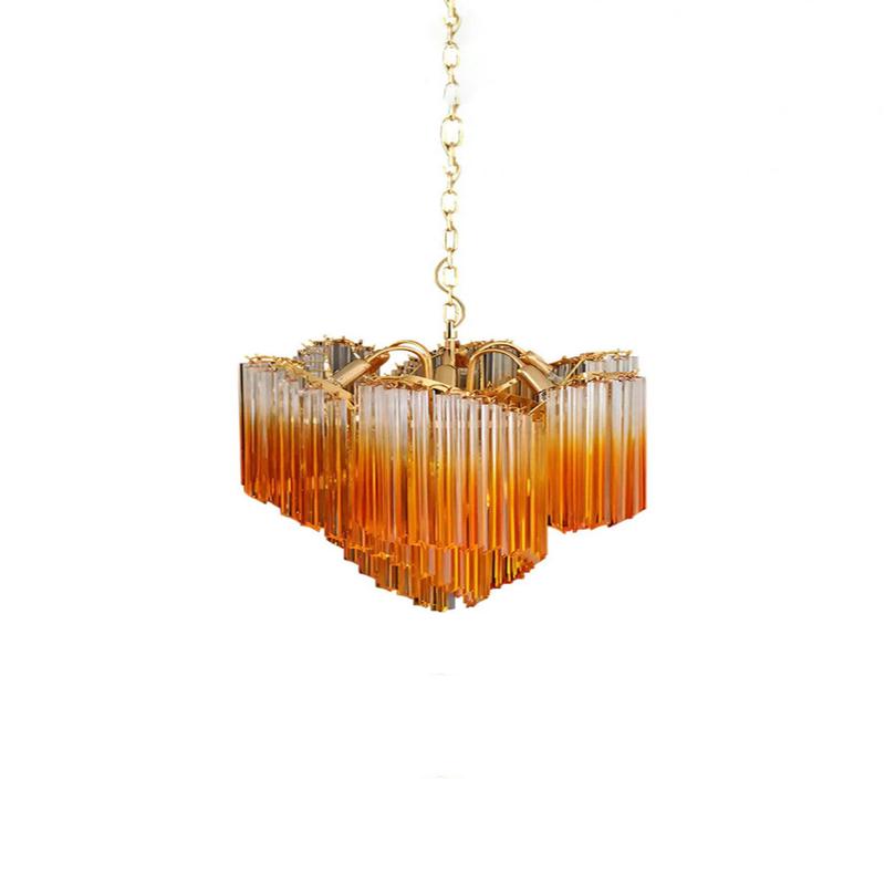 The Shaded Amber Murano Crystal Prism Chandelier is an elegant and warm chandelier that presents a fascinating visual effect with its amber-toned Murano crystal prisms. Each crystal prism is made with superb handcraftsmanship, with a smooth and delicate surface and a gradient amber color. The tones from deep to light add a rich sense of layering to the lamp. When the light passes through the crystal prisms, the soft light is refracted and filtered, creating a warm and charming atmosphere.