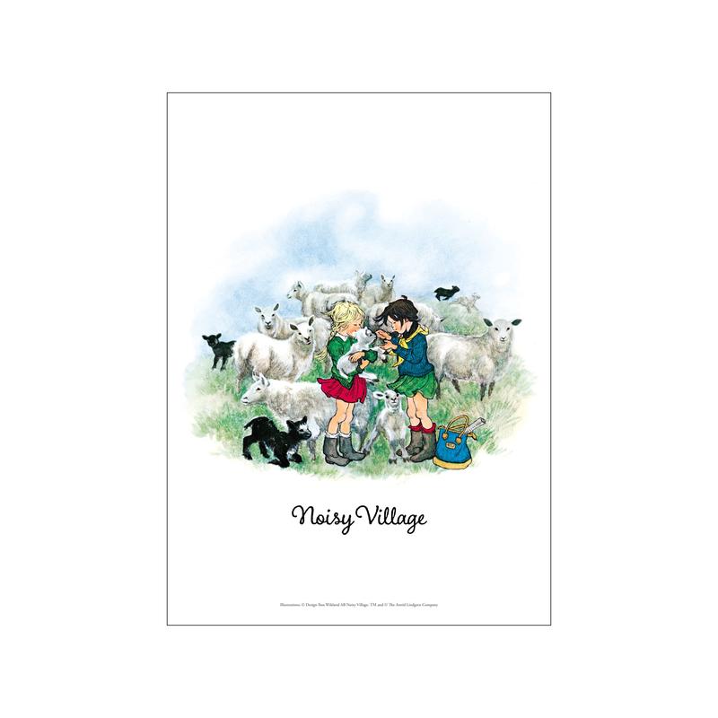 Celebrate pastoral life with this beautiful Noisy Village poster featuring Kerstin and Anna surrounded by sheep and lambs in a lush green meadow. This timeless artwork brings soft colours and gentle farmyard magic to your walls.