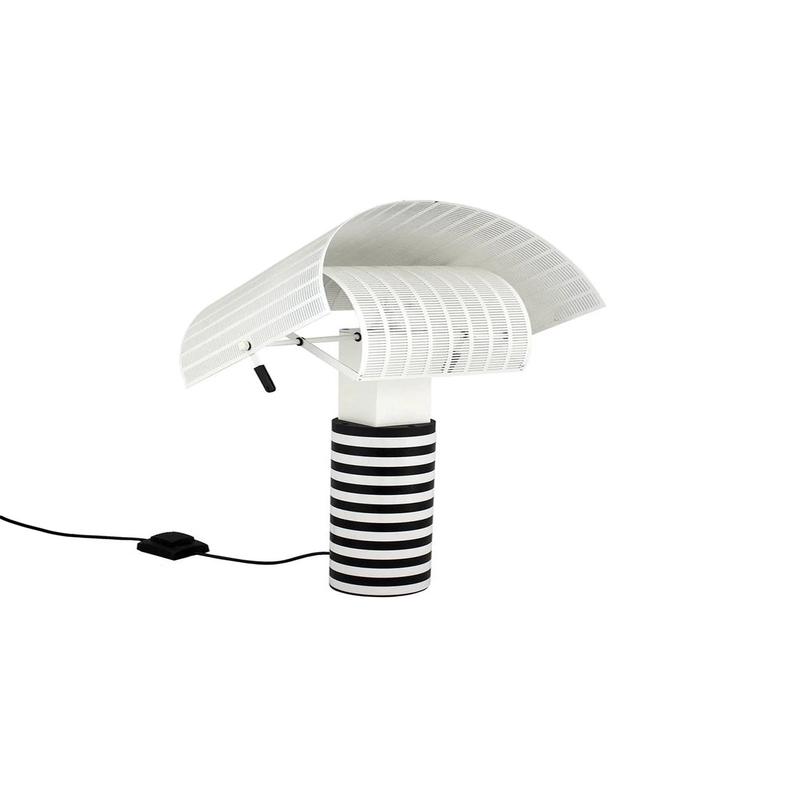 The Shogun Table Lamp showcases impressive geometric elements and a striking black and white striped base. Its adjustable metal shades offer customizable lighting options, while the enameled perforated shades create stunning shadows on your walls for a beautifully ambient atmosphere.