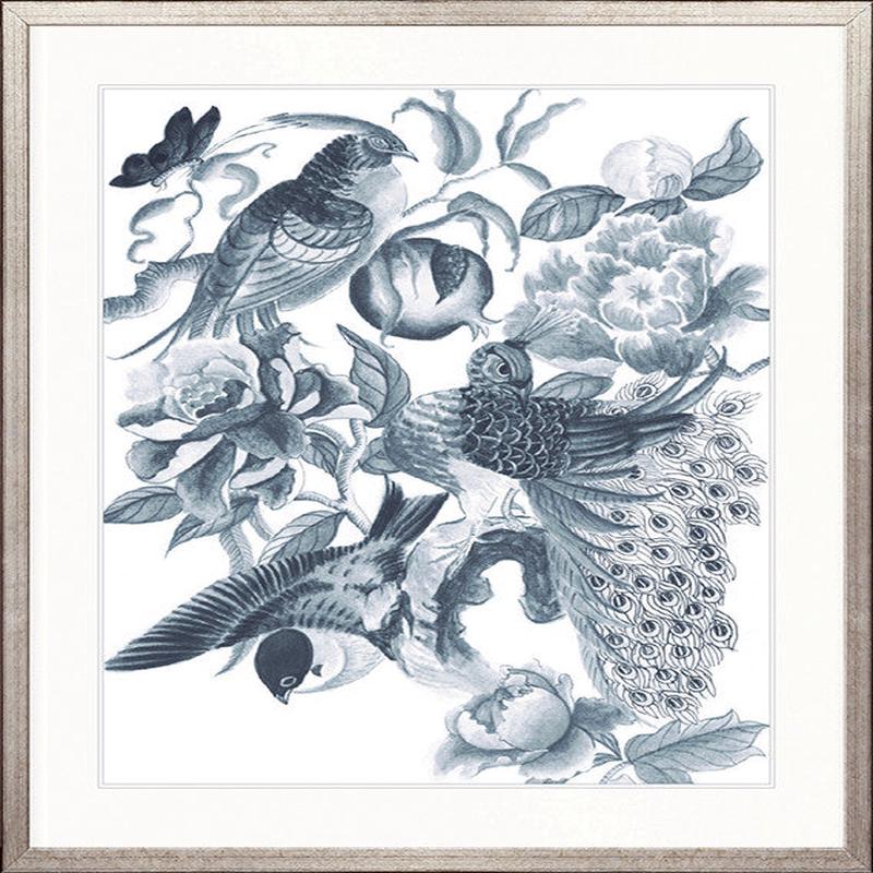 A refined series of intricate chinoiserie illustrations in elegant blue-grey tones. Featuring exotic birds, florals, and delicate foliage, these artworks evoke timeless sophistication and add graceful decorative charm to both traditional and contemporary spaces.