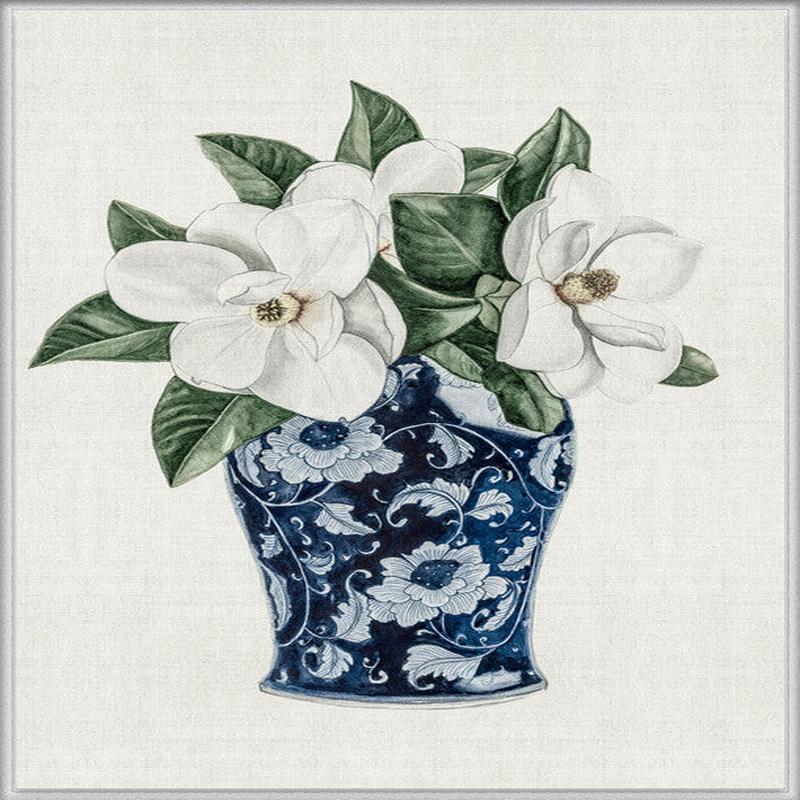 A charming collection of floral still-life artworks, featuring delicate peonies, magnolias, and lush blooms in ornate blue and white chinoiserie vases. Soft yet vibrant, these pieces bring timeless elegance and refined botanical beauty to any space.
