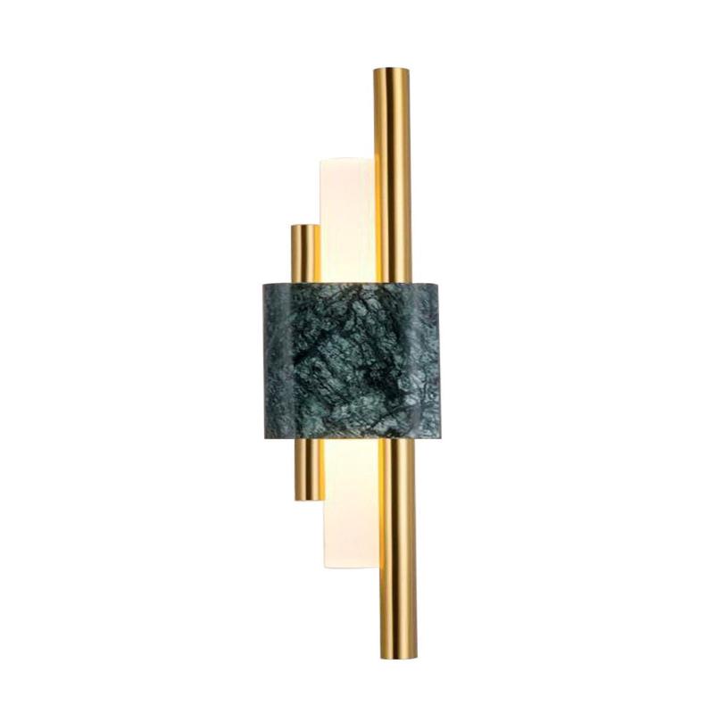 The Tanto Wall Light is a stylish lighting fixture that combines modern design elements with functionality. The slim yet dynamic brass rods and central cylindrical opal lamp create a unique asymmetrical look, while the marble front adds a touch of elegance. Illuminate any space with this statement piece.