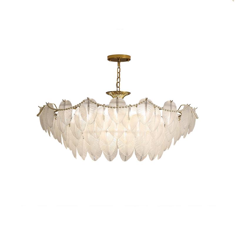 This one-of-a-kind Crystal Feather Chandelier boasts a stunning blend of feather-inspired design and ornate wrought iron details. The intricate lines and circles create a three-dimensional aesthetic, while the diamond-textured glass lampshade provides a comfortable and non-glare light quality. The overall lighting design exudes a sense of hierarchy and depth, making it a perfect addition to any space.