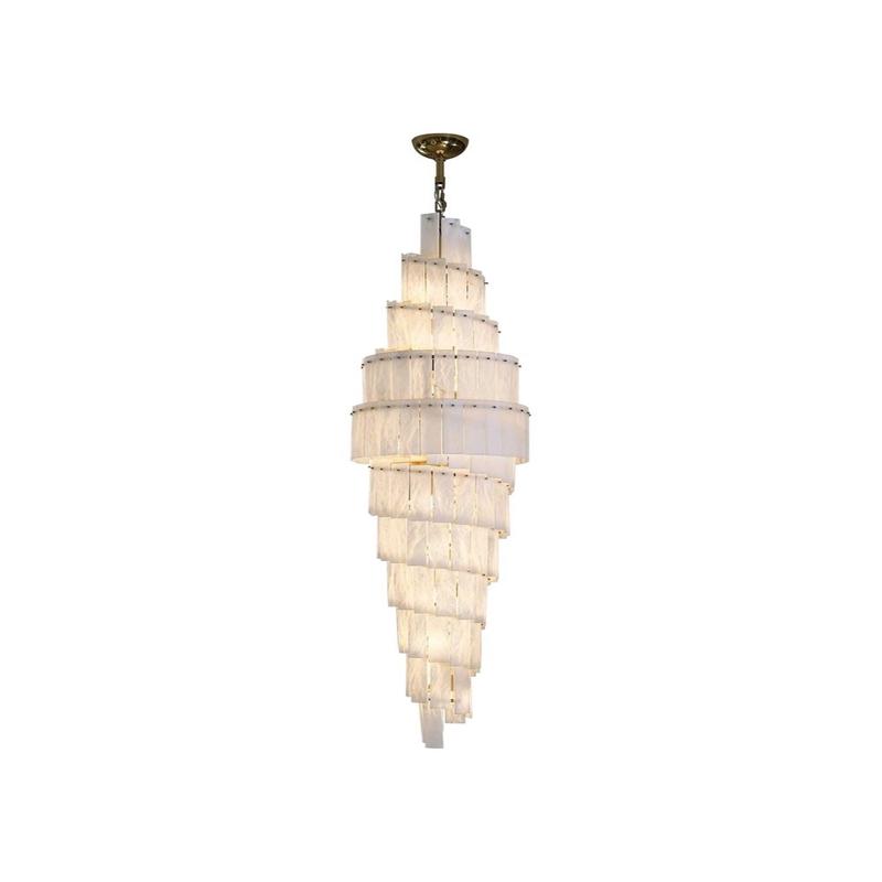 Enhance your living space with the elegant Tiered Alabaster Staircase Chandelier. This chandelier, designed in a refined Art Deco style, showcases stacked alabaster panels and a glowing gold finish, serving as an ideal centerpiece to elevate the sophistication of any living room.