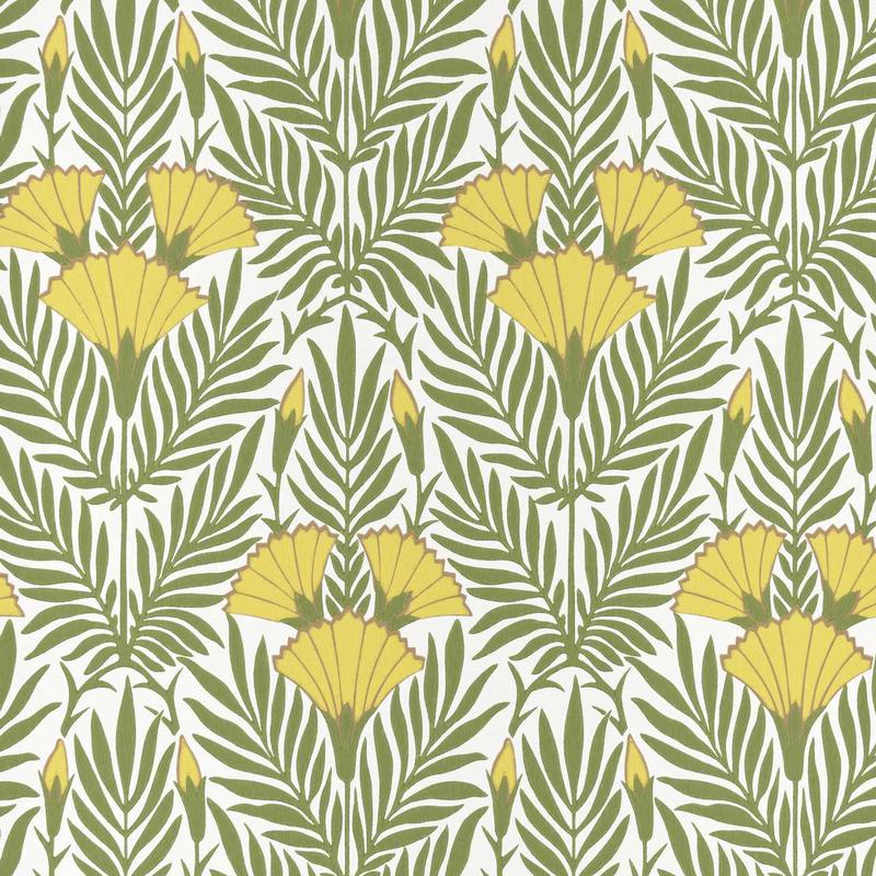 Arts and Crafts practitioners, like George Charles Hait, advocated design that stylised nature, reducing flowers and foliage to a series of formal, symmetrical shapes. A highly talented artist and illustrator, Hait began designing wallpaper in the 187s and produced designs for various companies including Jeffery & Co., Essex & Co., William Woollmans and Arthur Sanderson & Sons. An elegant pattern drawn from a 19th century design for wallpaper, composed of a fan shaped floral motifs within an arrangement of delicate foliage, the style of Hait’s work crosses the Arts and Crafts and Art Nouveau Movements. The decorative effect is also reminiscent of the glamorous Art Deco style. Perfect in its simplicity. Hait’s artistry is further amplified with strong fresh colours to bring a touch of modernity to the enduring design.
