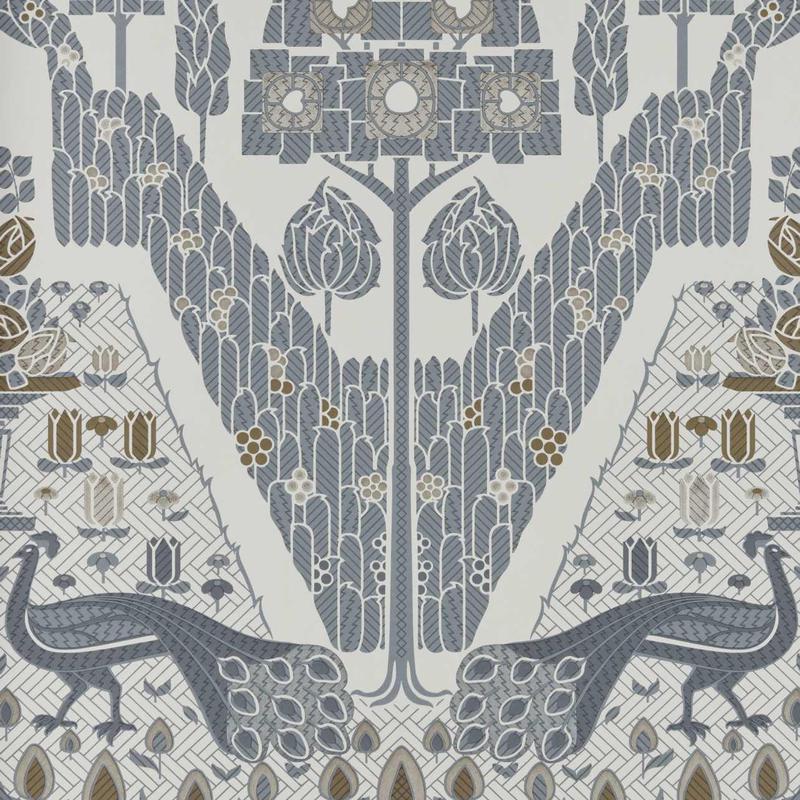 A joyful arrangement of manicured lawns, sculpted hedges, tulips and a proud, strutting peacock, this pattern is by the Silver Studio, a design practice based in Hammersmith, London. Founded in 1880 by Arthur Silver, the Silver Studio sold designs for items such as furnishing fabrics, wallpapers, tablecloths, rugs and carpets to a range of commercial customers both in Britain and abroad. It employed a number of designers, some of whom were well known in their own right, and others whose work remained anonymous. Originally created as a furnishing fabric of woven silk, the topiary pattern is the epitome of stately opulence and illustrates the stylisation of organic and natural forms that tied the Art Nouveau aesthetic together and characterised English interior design in the early 20th century.
