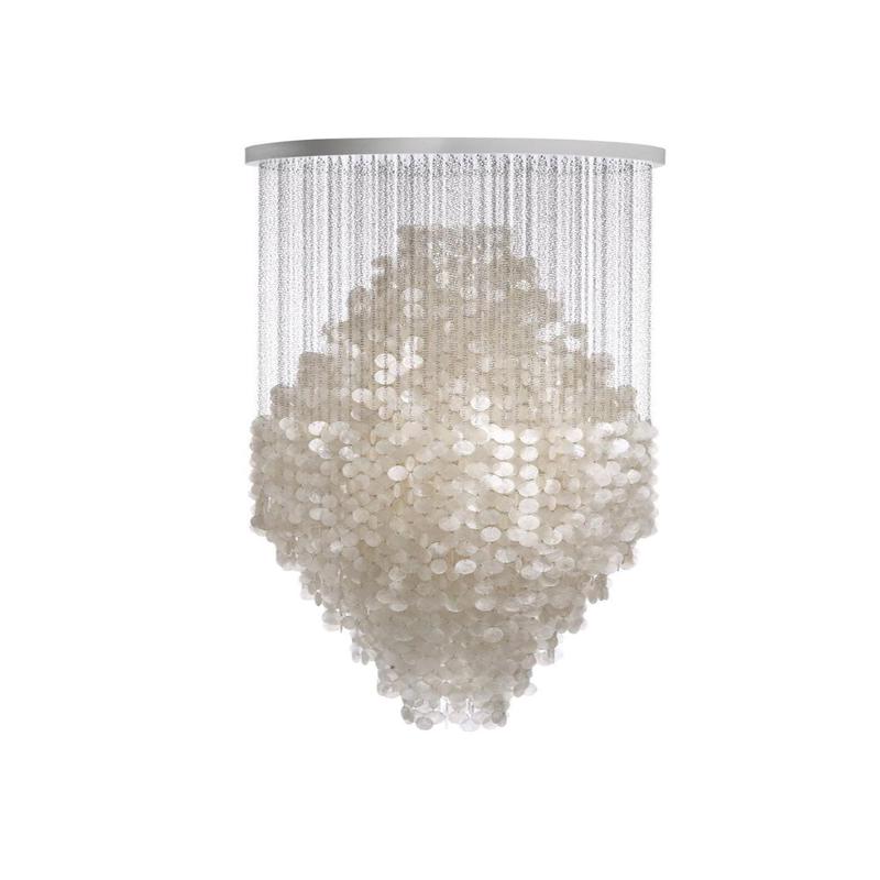 The Verpan Fun 8DM Shell Chandelier light was designed by Verner Panton in 1964 as part of his FUN collection which is considered one of Panton’s greatest masterpieces. The exquisite design was inspired by a trip to Malaysia where Panton discovered the beauty and dynamic nature of the seashell material. The way in which the seashell discs are delicately strung on small metallic chains allows the strands of discs to sway in the air. This movement is an iconic feature of these suspended ceiling lights which create a chiming sound as air travels through the shade.