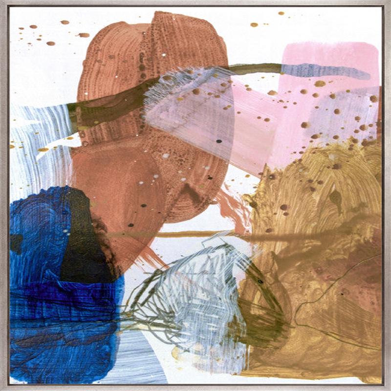 A bold and playful abstract series featuring expressive brushstrokes in deep cobalt blue, warm ochre, soft blush pink, and gentle grey. Layered textures and spontaneous splatters create a dynamic, contemporary feel perfect for modern, creative spaces.