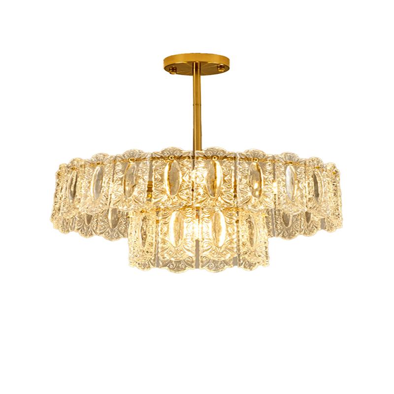 Hand-formed glass petals with Clear tints make up the frame opulent Decorative Pattern Glass Round Chandelier. Each petal is made from glass and features gold finish, while golden frame are integrated throughout for a glimmering silhouette.