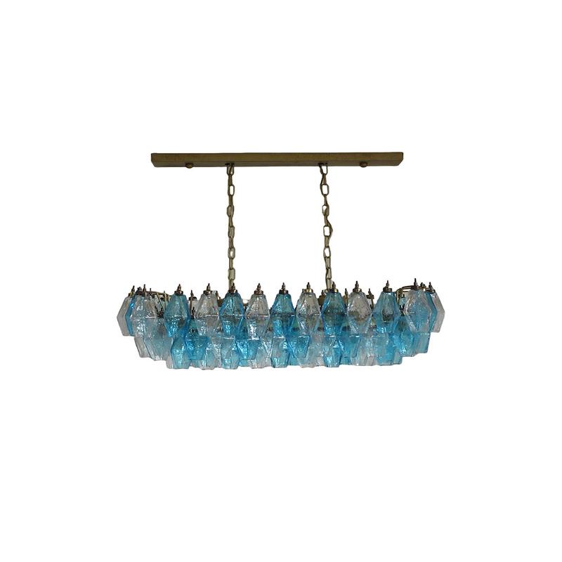 This vintage blue and clear glass Murano Poliedri chandelier stands out with its exquisite handmade glass design and fresh color matching, and is a classic of Murano craftsmanship. The lamp body is composed of dozens of unique polyhedral glass (Poliedri), with blue and clear glass arranged alternately, creating a fresh and elegant visual effect. These glass components show dazzling light and shadow effects under the illumination of the light, giving the space a unique artistic atmosphere.