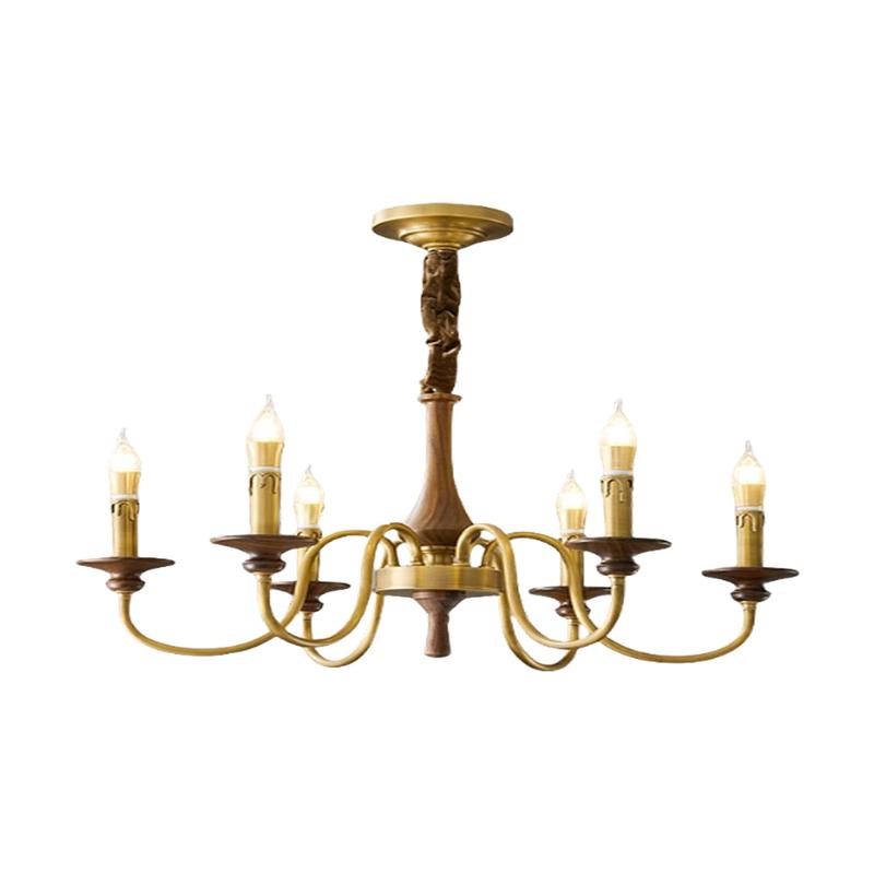 This Vintage Brass Candle Chandelier features brass and walnut wood with elegant glass candle-style shades. Its retro design adds a touch of classic charm and sophistication to any space.
