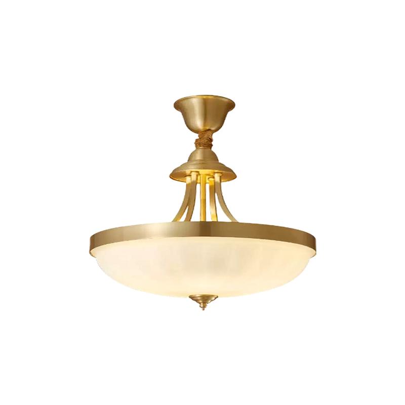 This Antique Brass and Glass Chandelier features an elegant brass frame and glass shade that emits a soft, warm glow. Its timeless design adds a sophisticated touch to any room.