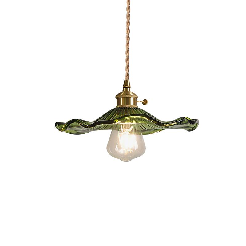 The Vintage Glass Hibiscus Flower Pendant Light is inspired by Art Nouveau era lights, featuring a fluted glass lampshade and brushed brass lamp holder. The lampshade is expertly crafted, evoking a sense of nostalgia and elegance.