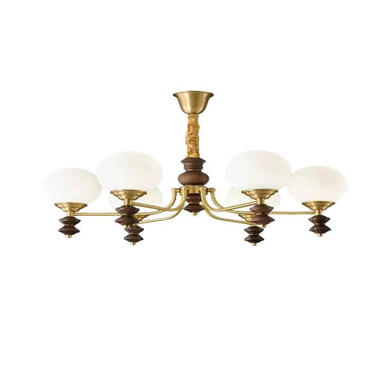 This vintage-style walnut wood chandelier features elegant brass accents and glass shades. white globe shades emit soft light, perfect for various home decor settings.