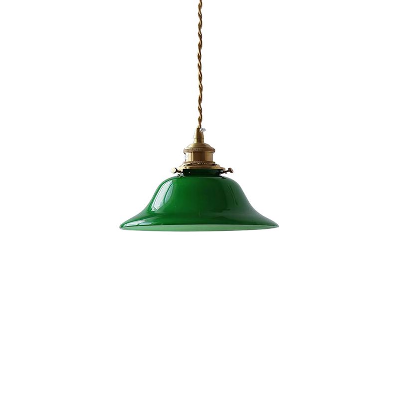 A Vintage Green Bell Pendant Light features a green glass shade, a brass round ceiling, and a 150 cm brown cable with an E27 bulb base, making it perfect for use in a variety of spaces, such as dining rooms, kitchen bars, and bedrooms. This unique lighting option offers bright and distinctive illumination.