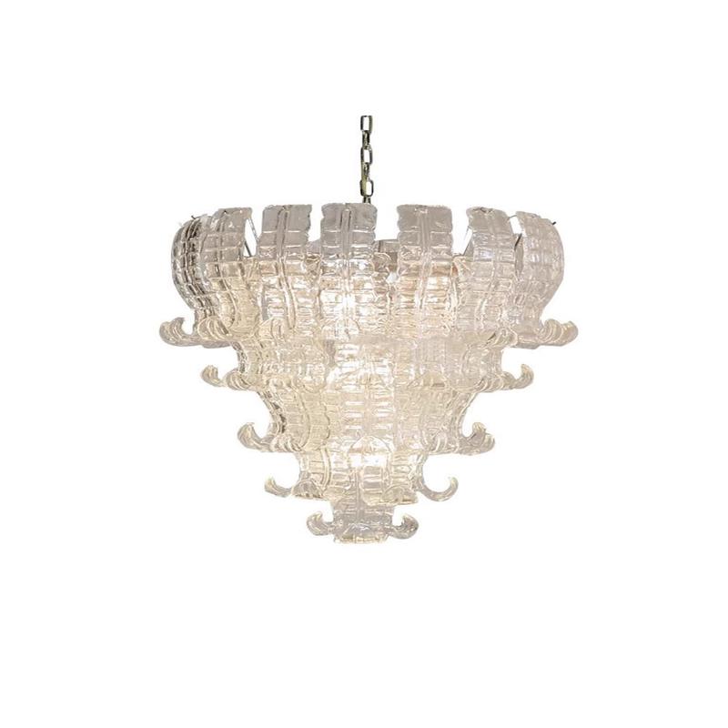 Vintage Italian Murano glass chandeliers showcase exquisite Venetian craftsmanship with hand-blown Murano glass elements. These cascading chandeliers, suspended beneath ornate metal details, create a stunning, dazzling centerpiece, perfect for a grand entryway, dining room, or living space. Each piece embodies the centuries-old tradition of Murano glass, seamlessly blending practicality with sculptural beauty.