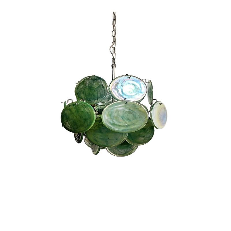 Elevate your space with our Vintage Murano Green Discs Chandelier. The handcrafted nickel frame is framed by iridescent green discs, creating a truly mesmerizing light effect. It’s more than just a fixture, it’s a dazzling work of art that adds an enchanting touch to any room.