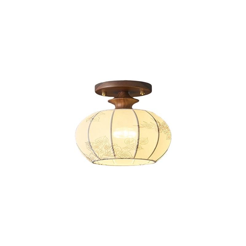 Featuring a printed fabric shade paired with walnut and brass accents, this vintage ceiling light creates a retro style that brings warmth and elegance to any space.