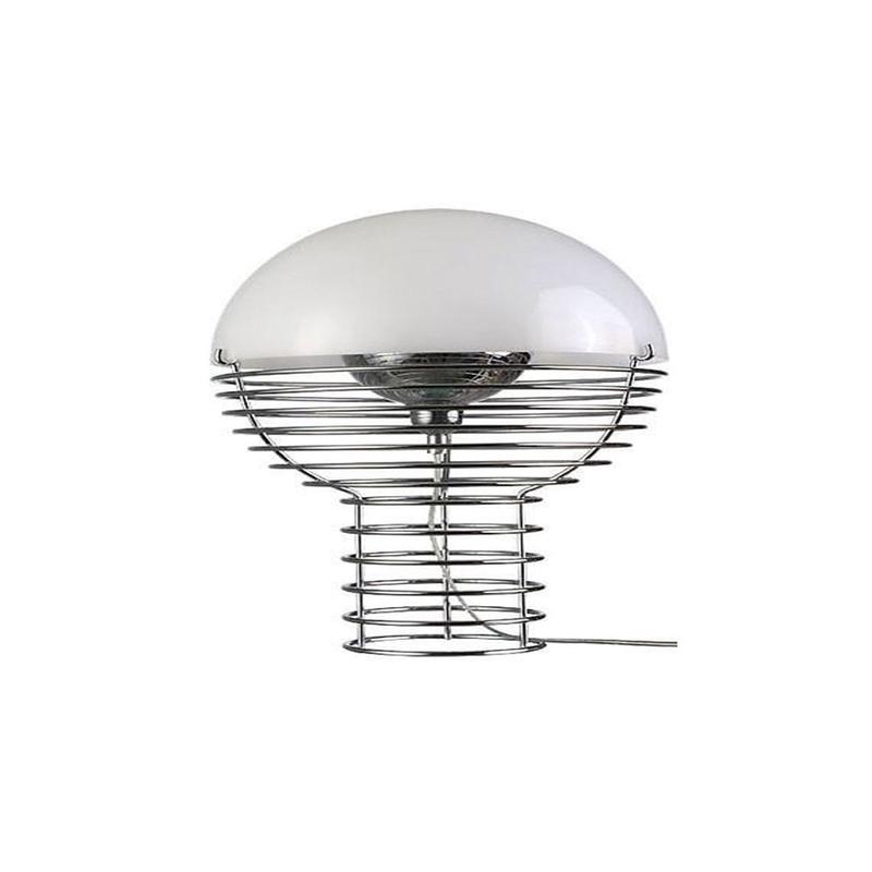 The Wire table lamp features a unique design with a chrome-plated steel wire frame and a white hemispherical plastic shade. A small metal reflector contains the bulb, directing light to the inside of the shade. This combination creates a distinctive yet airy and unobtrusive look, providing ample ambient lighting.
