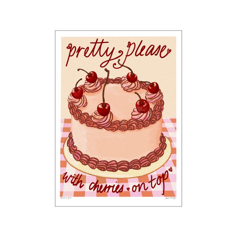 This artwork by Emma Forsberg is a playful, retro-style illustration of a pink frosted cake decorated with swirls of icing and topped with bright red cherries. The cake sits on a plate over a pink-and-white checkered tablecloth, evoking a cozy feel.